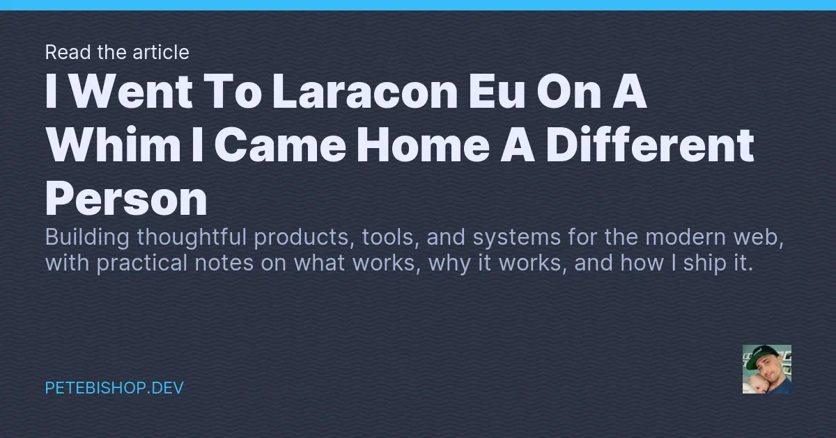 Pete BishopA heartfelt personal account of attending Laracon EU on impulse, sharing experiences from the MostlyTechnical pre-party to working the Artisan Desk and meeting Laravel community legends like Taylor Otwell and Aaron Francis. The author reflects on how the genuine, welcoming nature of the Laravel community transformed what started as a spontaneous decision into a deeply meaningful professional experience.